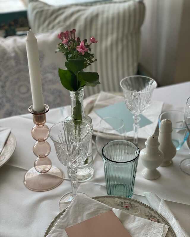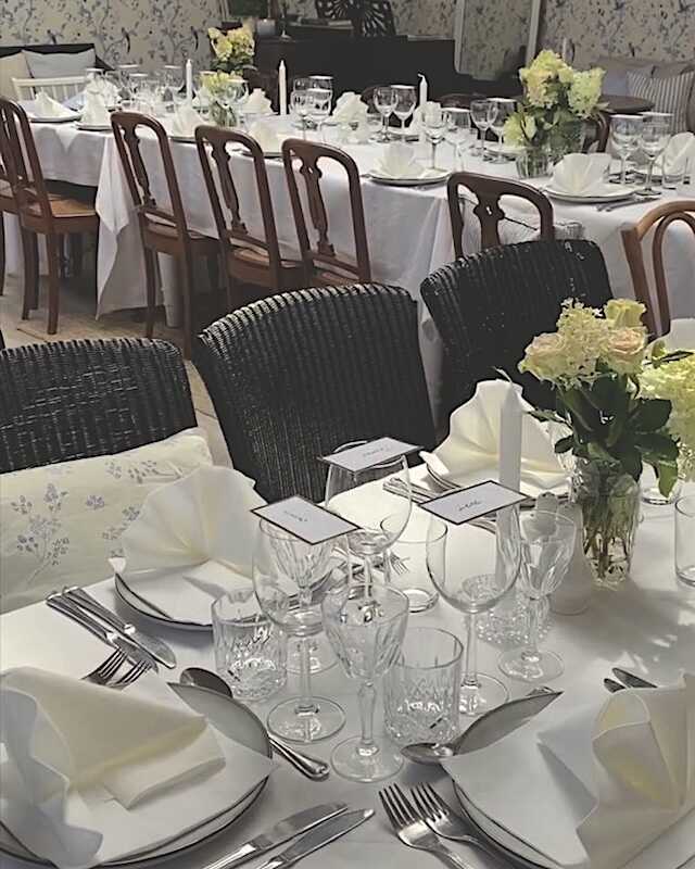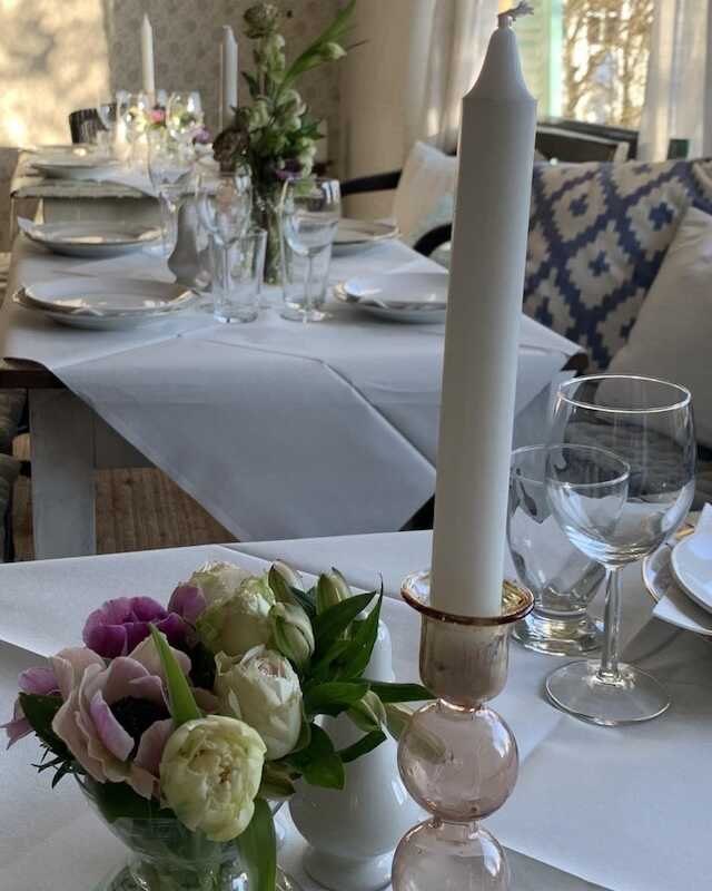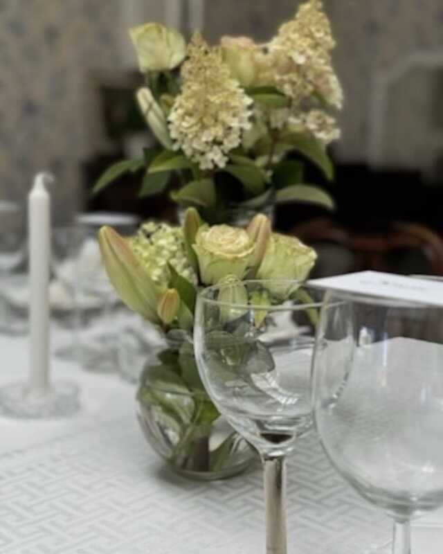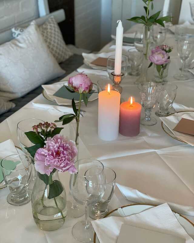 Vi pynter smukt op med hvide duge og friske blomster, så stemningen er både indbydende og elegant. Maden kan designes efter dine præferencer, så du og dine gæster får en kulinarisk oplevelse, der passer til lejligheden.